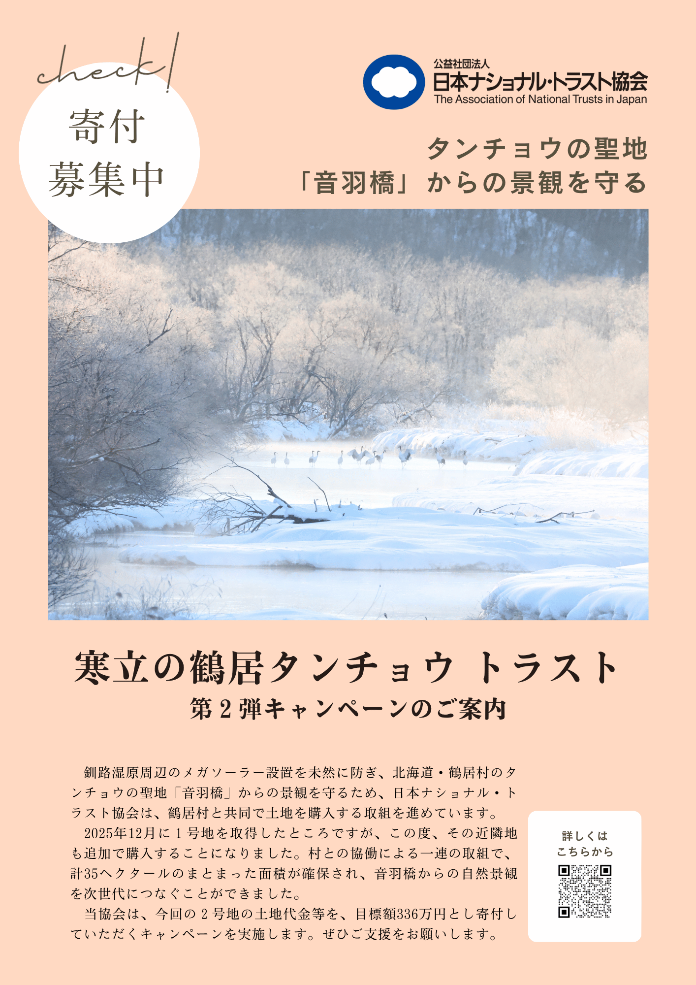 2026/4/6「鶴居タンチョウトラスト」キャンペーン実施中寄付キャンペーン第2弾のチラシの配布を開始しました。こちらからダウンロードできます。キャンペーンの詳細は特設ページをご覧ください。 |